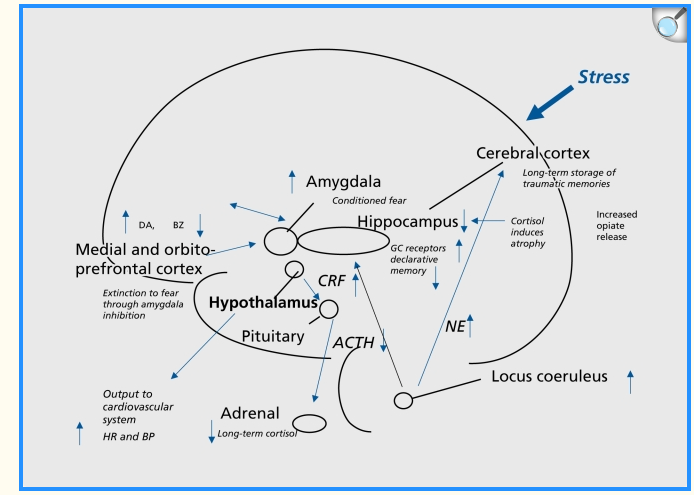 “Figure 1. Lasting effects of trauma on the brain, showing long-term dysregulation of norepinephrine and Cortisol systems, and vulnerable areas of hippocampus, amygdala, and medial prefrontal cortex that are affected by trauma. GC, glucocorticoid; CRF, corticotropin-releasing factor; ACTH, adrenocorticotropin hormone; NE, norepinephrine; HR, heart rate; BP, blood pressure; DA, dopamine; BZ, benzodiazapine; GC, glucocorticoid.”